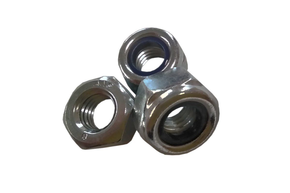 DIN 985 Гайка шестигранная самоконтрящаяся низкая с неметаллическим нейлоновым вкладышем, устанавливается в изделия, где скрепляемые узлы находятся в труднодоступных местах, а соединения подвержены вибрационным и ударным нагрузкам.